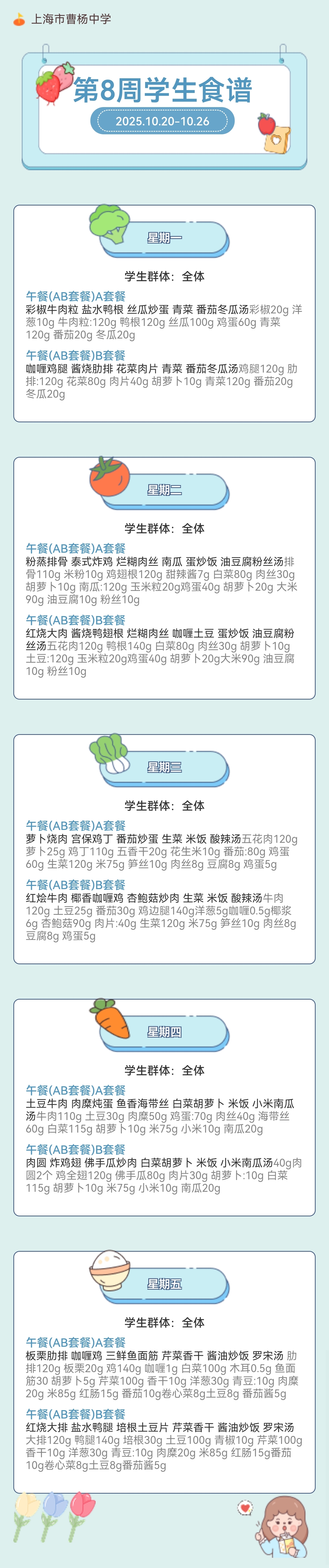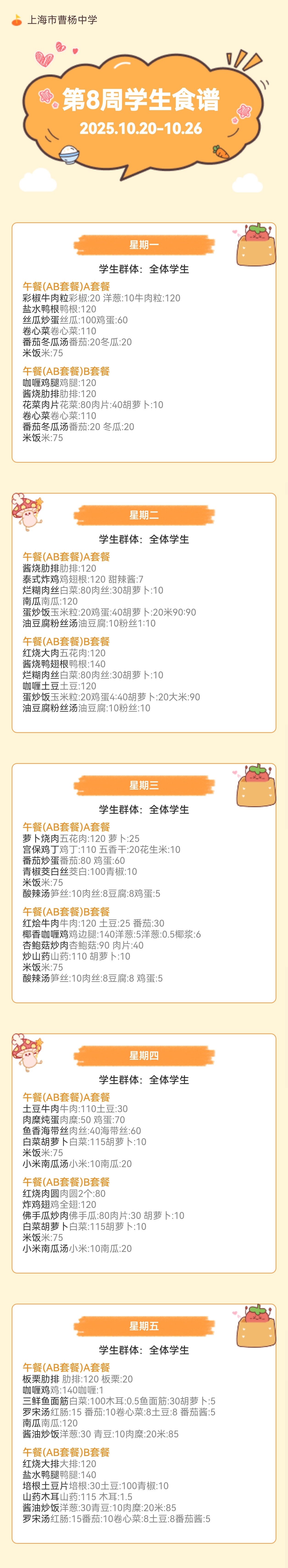 上海市曹杨中学学生菜单(2025年10月20日至2025年10月26日)