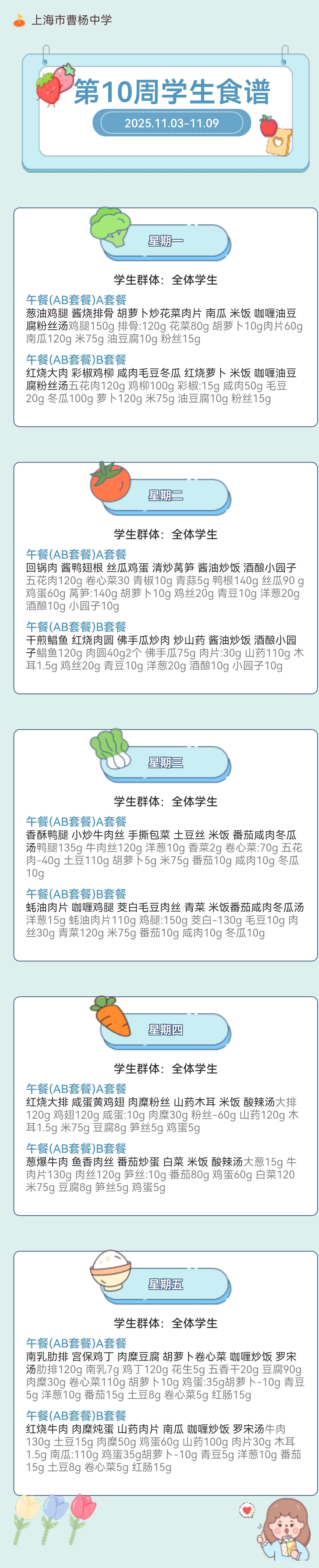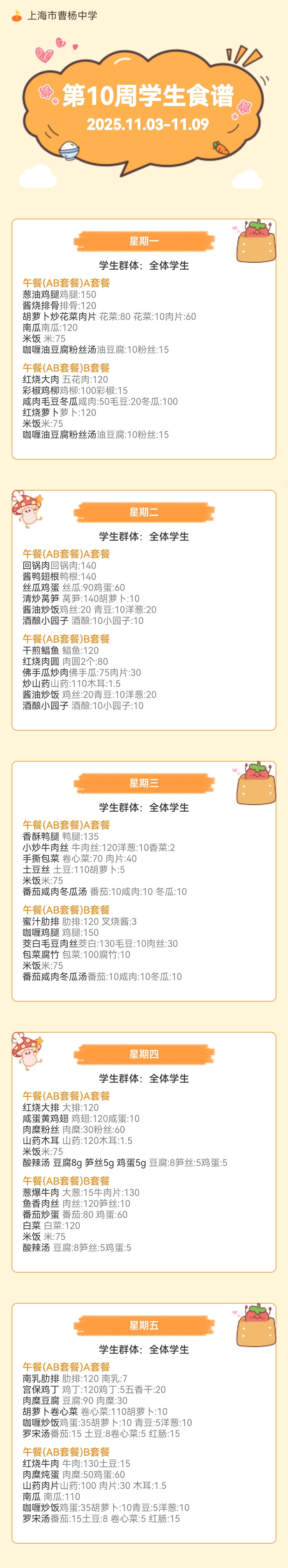 上海市曹杨中学学生菜单(2025年11月03日至2025年11月09日)