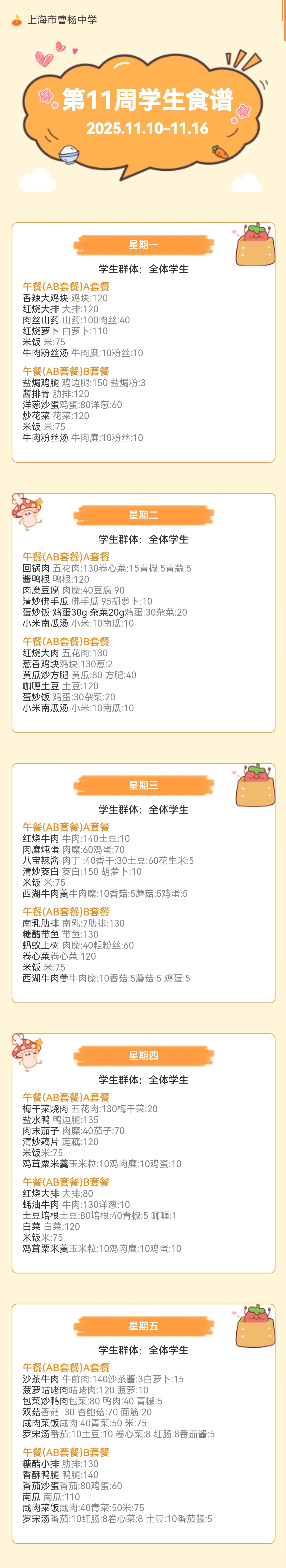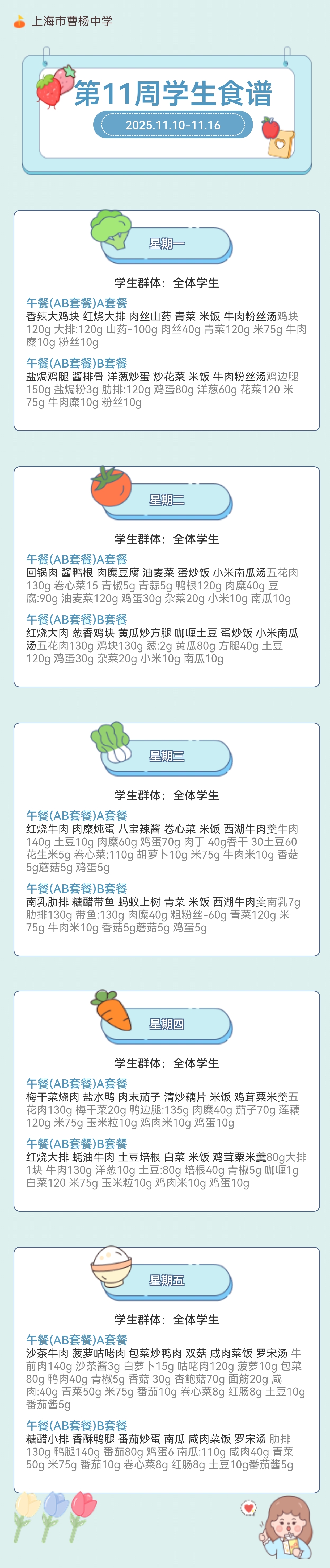 上海市曹杨中学学生菜单(2025年11月10日至2025年11月16日)