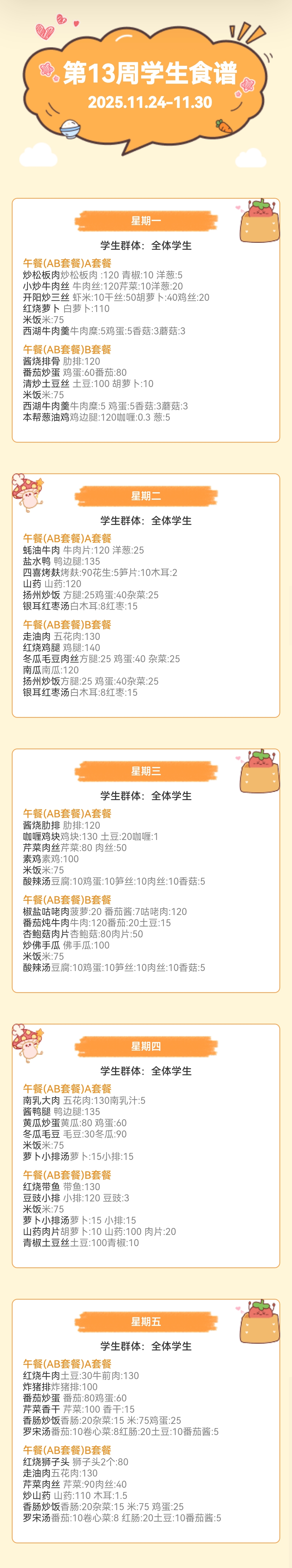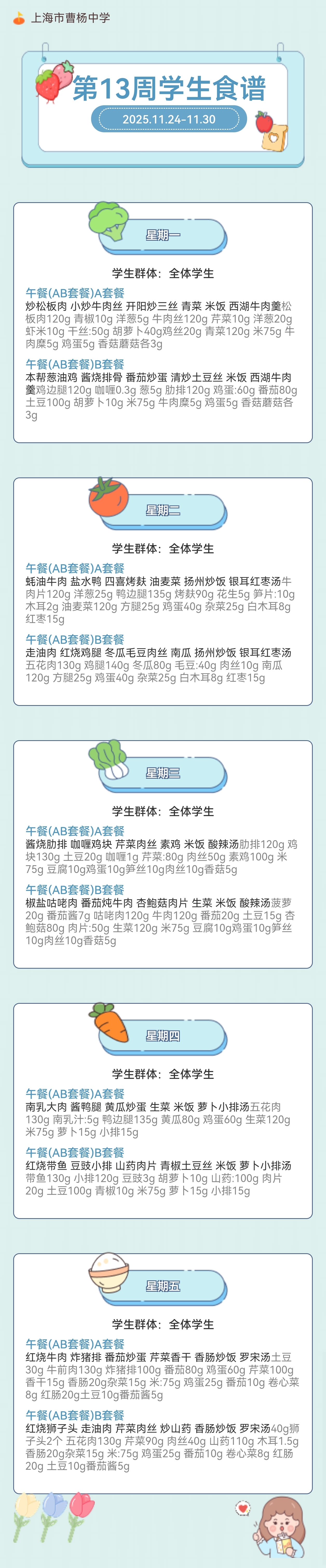 上海市曹杨中学学生菜单(2025年11月24日至2025年11月30日)