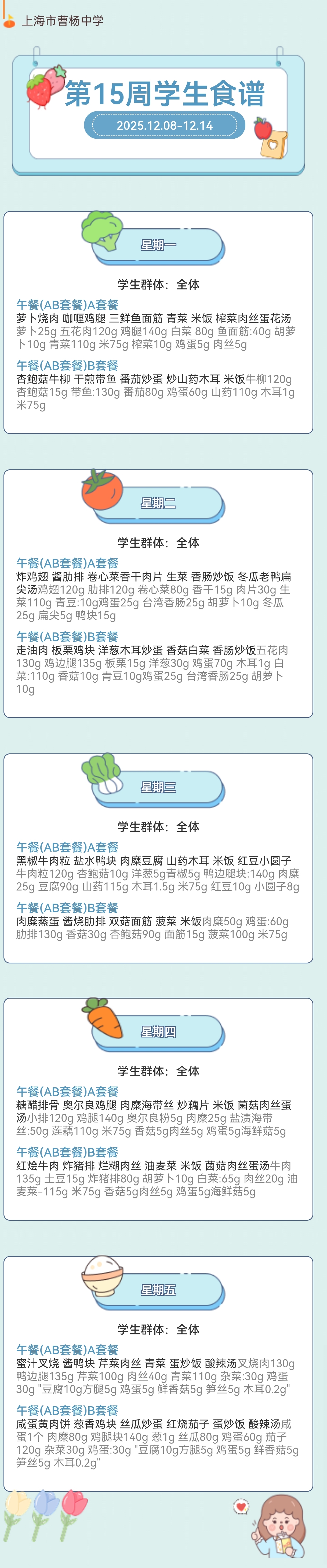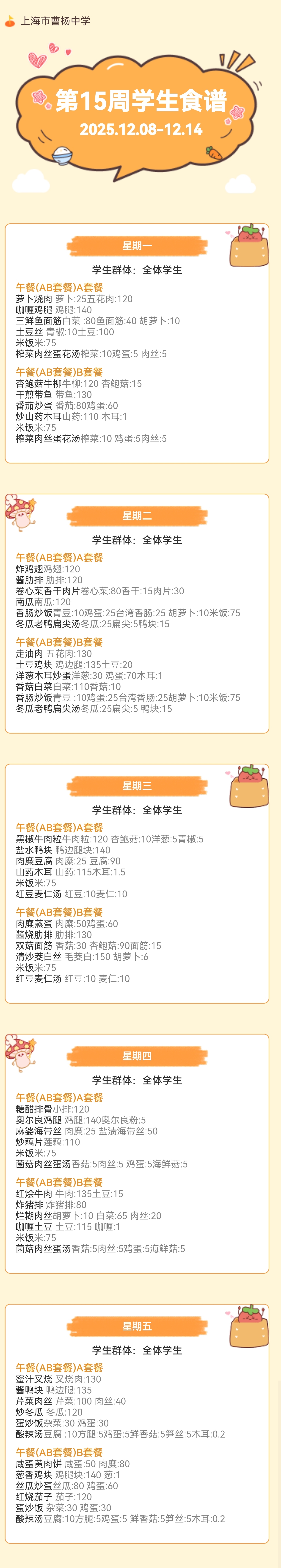 上海市曹杨中学学生菜单(2025年12月8日至2025年12月14日)
