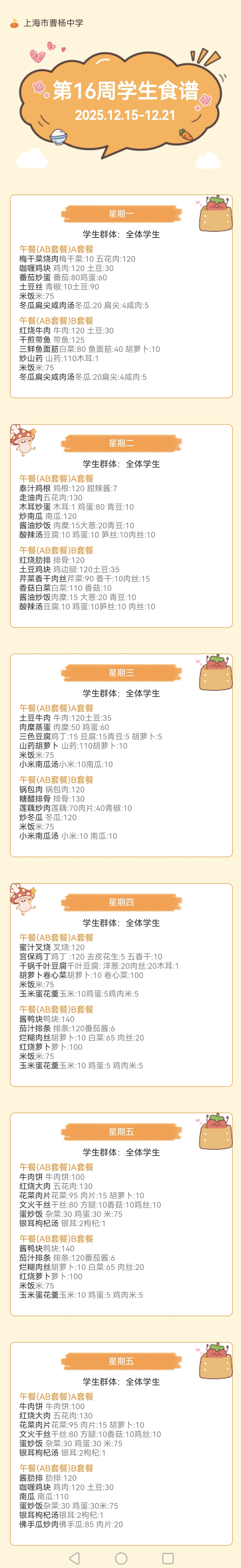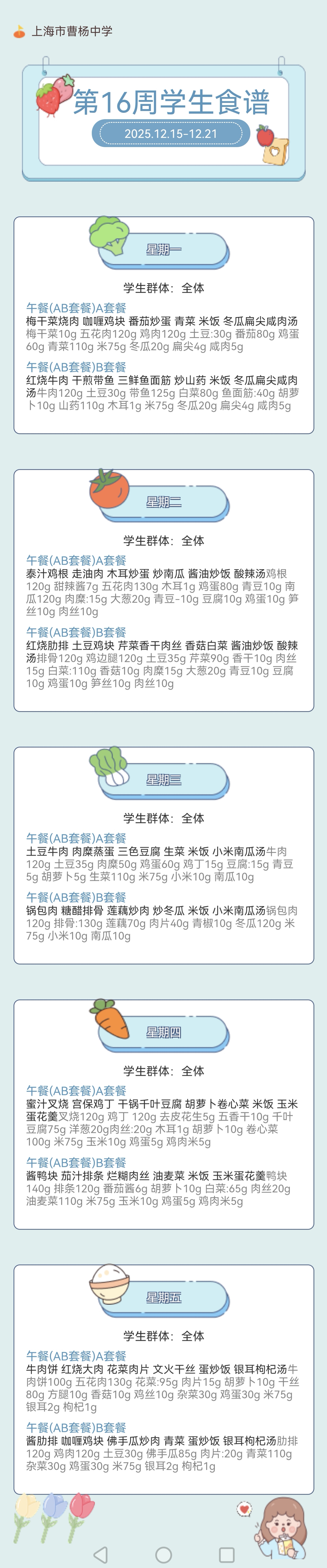 上海市曹杨中学学生菜单(2025年12月15日至2025年12月21日)