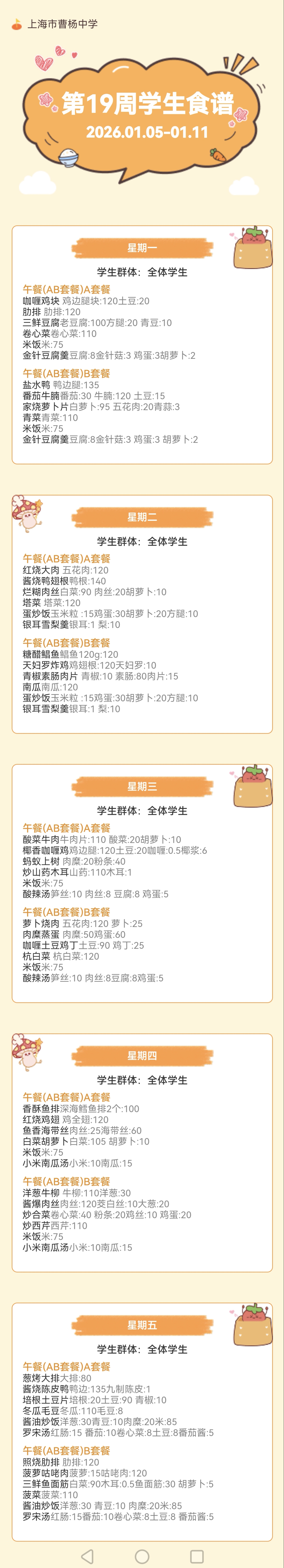 上海市曹杨中学学生菜单(2026年1月5日至2026年1月11日)