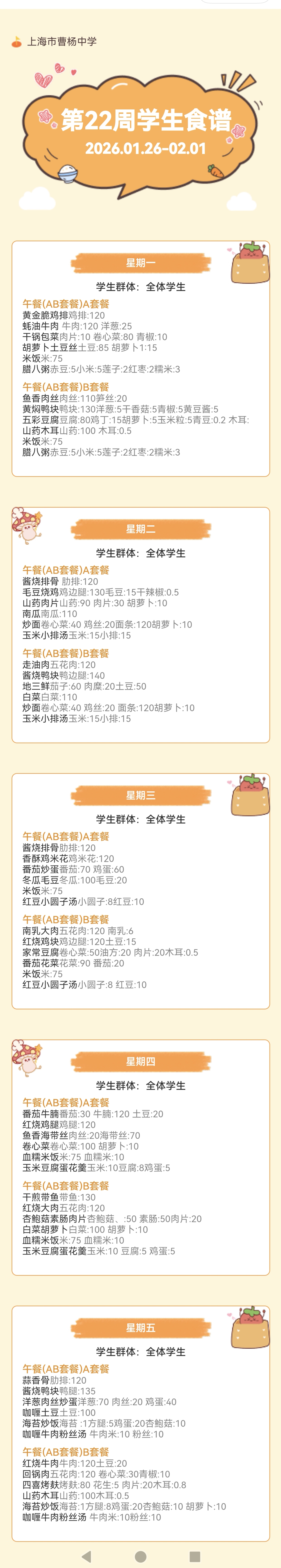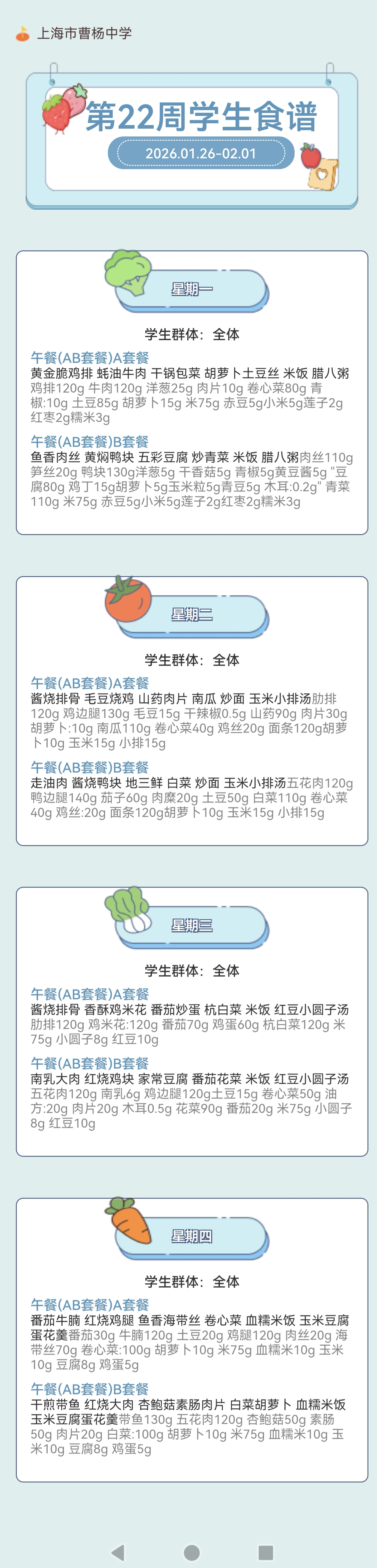 上海市曹杨中学学生菜单(2026年1月26日至2026年2月1日)