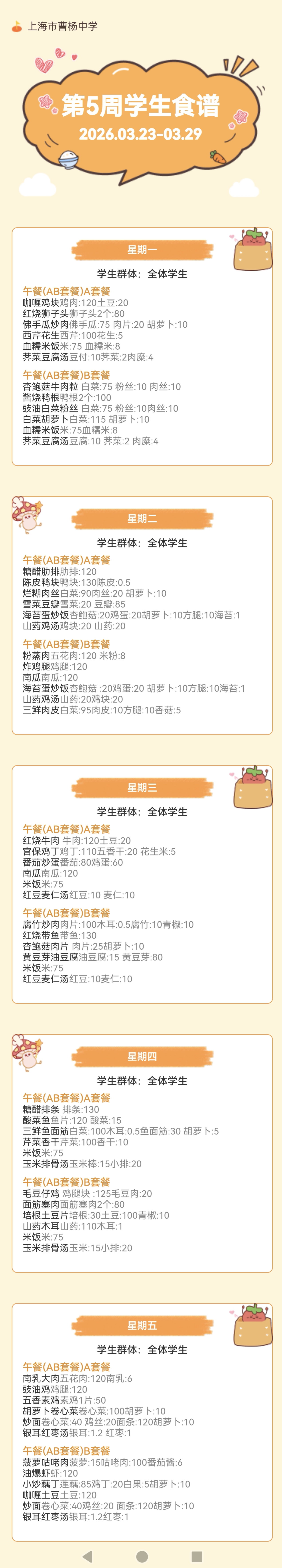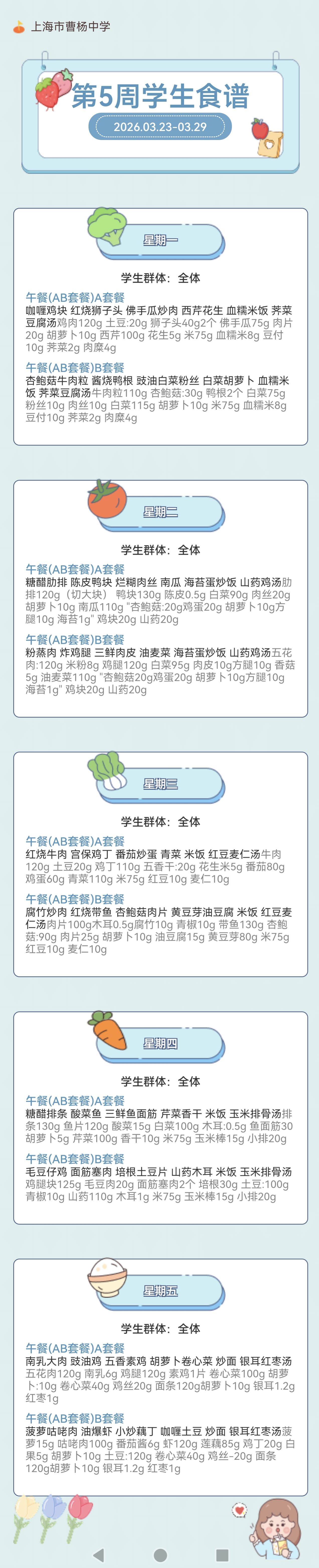 上海市曹杨中学学生菜单(2026年3月23日至2026年3月29日)