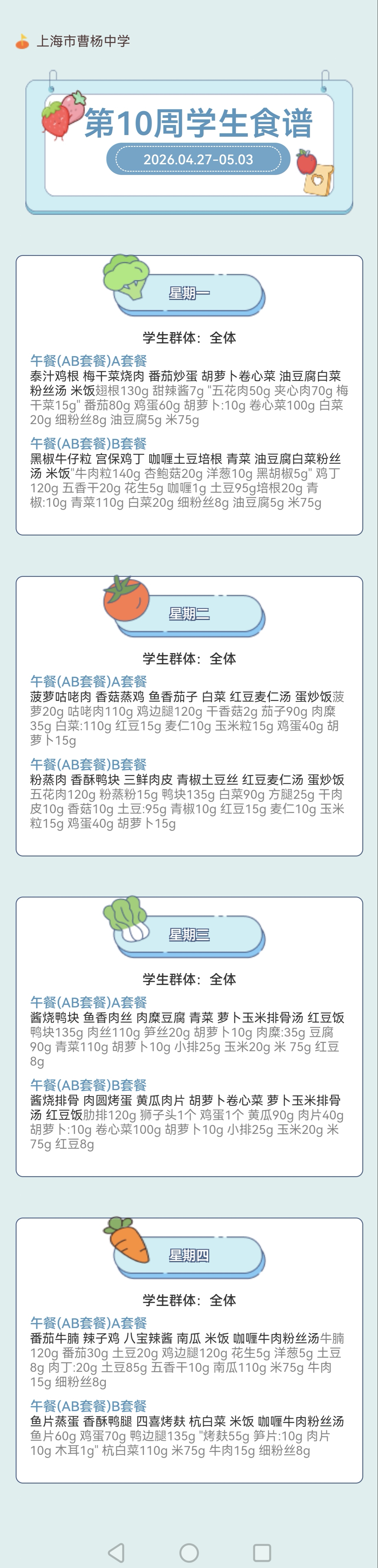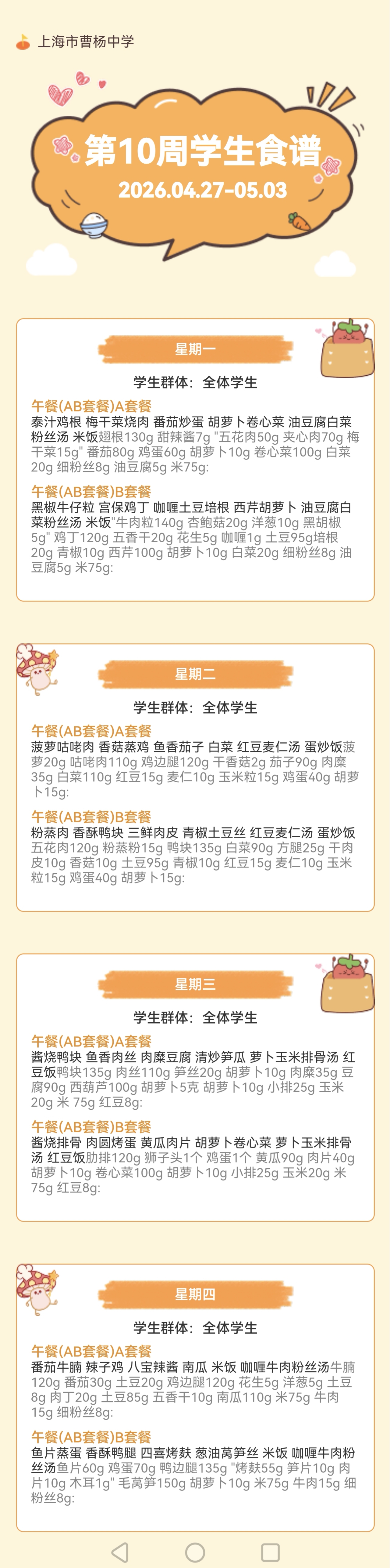 上海市曹杨中学学生菜单(2026年4月27日至2026年4月30日)