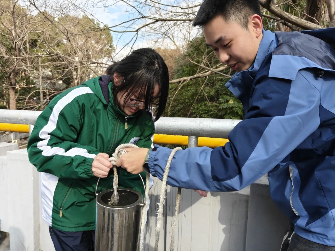 师生共同走进普陀区环境监测站,近距离参观专业监测设备与数据分析流程。同学们在工作人员的指引下认识了空气中有机污染物实时检测仪器,还在曹杨环浜中实地学习到了水质打捞和检测的方法,培养了同学们的专业操作技能,为后续自主测试打下良好基础,也让同学们沉浸式了解环境监测站的日常工作,明白在清溪翠岸的背后有这样一群默默坚守的“生态守护者”。
