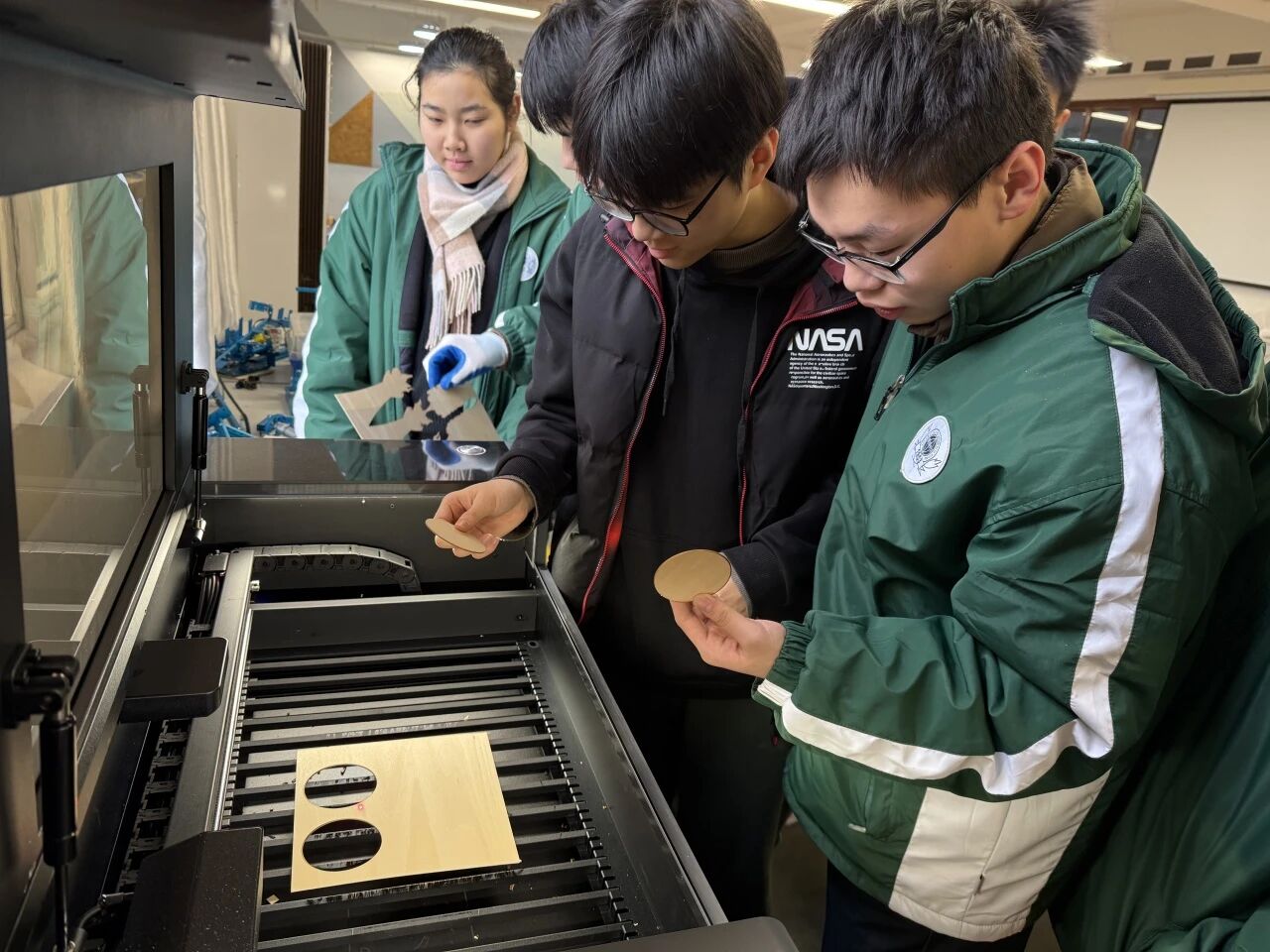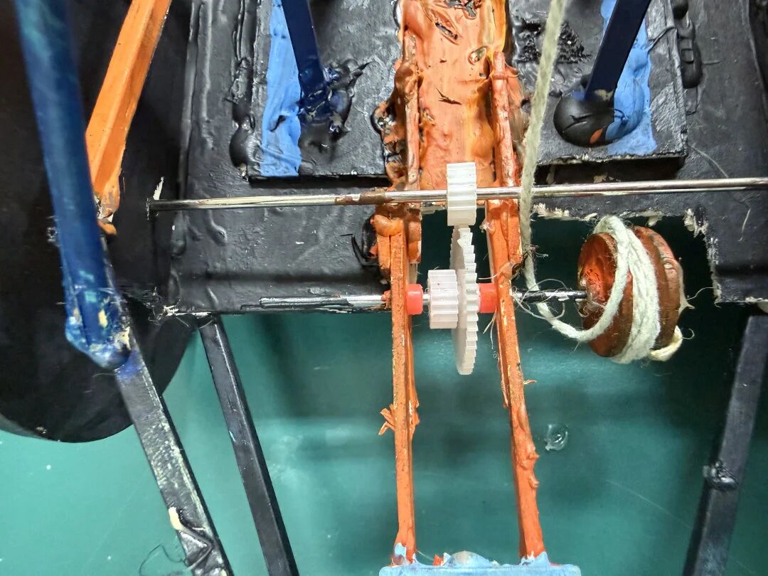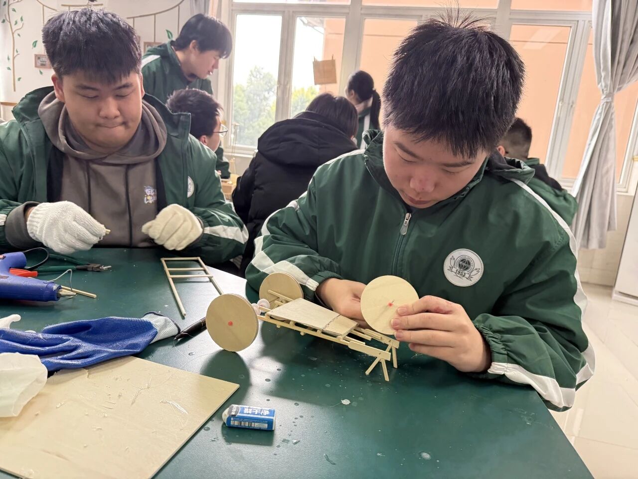同学们分工协作、默契配合,在老师的指导下,有条不紊地推进小车制作的每一个环节。同学们根据自己的需要利用激光切割机精准裁切所需的小车部件并细致打磨。一根根木条经过测量、标记、拼接、固定,交错搭建出稳固的小车底座。制作过程中,同学们主动联系课堂所学,将圆周运动的物理知识灵活运用到实践中,反复推敲、精心设计传动结构;结合机械原理,细致缠绕绳索、调试角度,通过精准控制重块下落速度,实现小车的平稳运行。在一次次试错、调整、完善中摸索技巧、积累经验,小车也慢慢初具雏形。