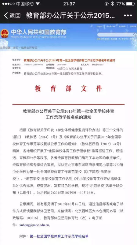 2015第一批全国学校体育工作示范学校