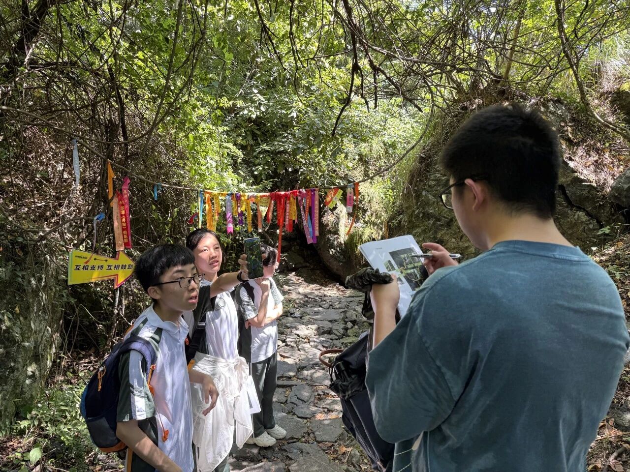 在有着千年历史的章里古道,同学们将前两天习得的知识与技能运用于实践,以“轻竞技+智趣任务”方式探秘自然。大家不仅完成古道徒步,还沿途观察不同的岩石种类,绘制高程图与等高线,测量竹林生物多样性,采集并识别植物的种子,测量古道的水质,真正做到学以致用。同学们还主动捡拾古道中的垃圾,时刻践行绿色环保的生活方式。