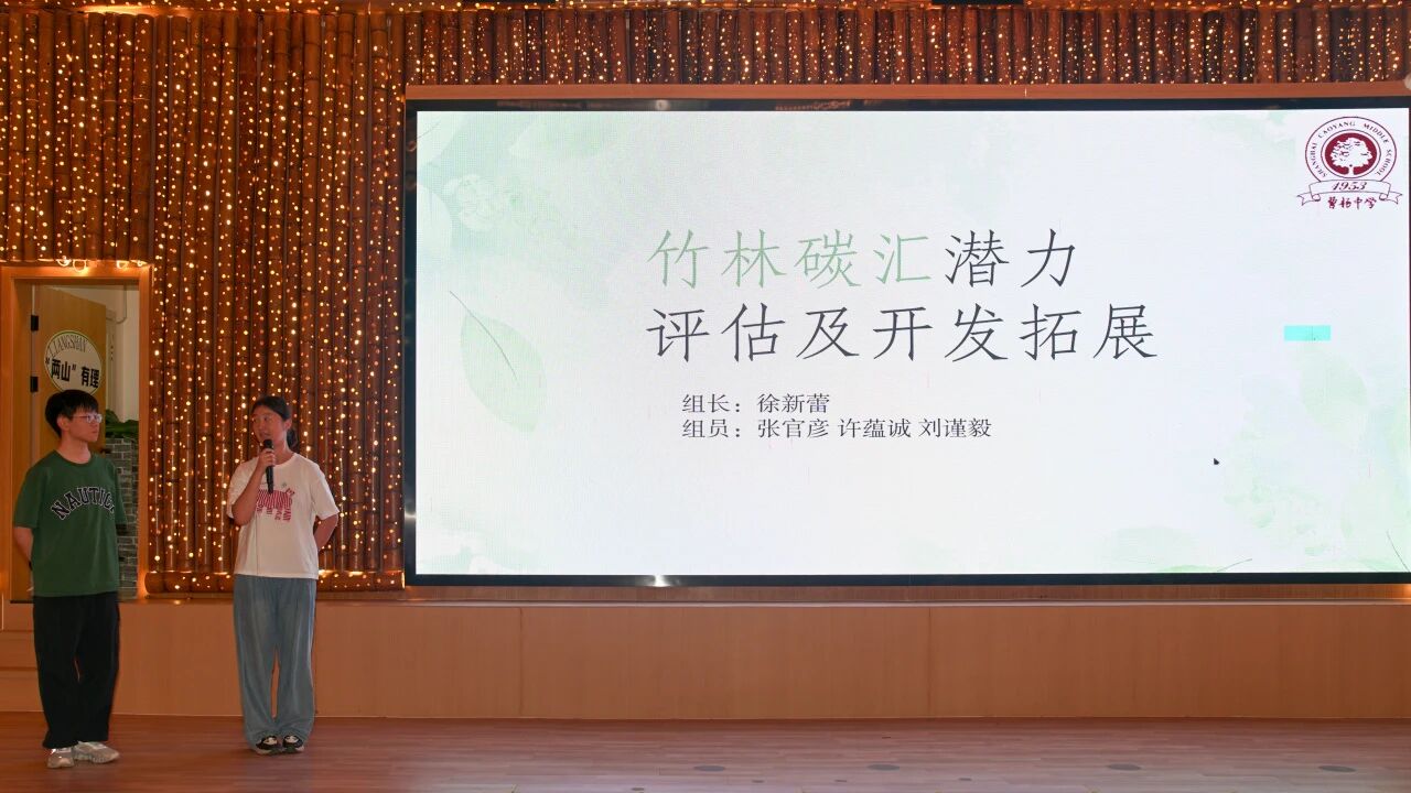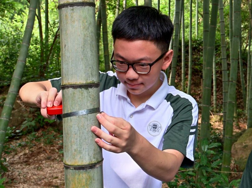 同学们深入竹林,认识竹的形态结构并辨认不同年龄的竹子,测量竹林中不同植物对CO₂的吸收效果,用样方法调查竹林生态多样性,计算竹林碳汇能力等,在探寻竹林奥秘的过程中提高了环境素养,用实际行动响应国家“双碳”目标。