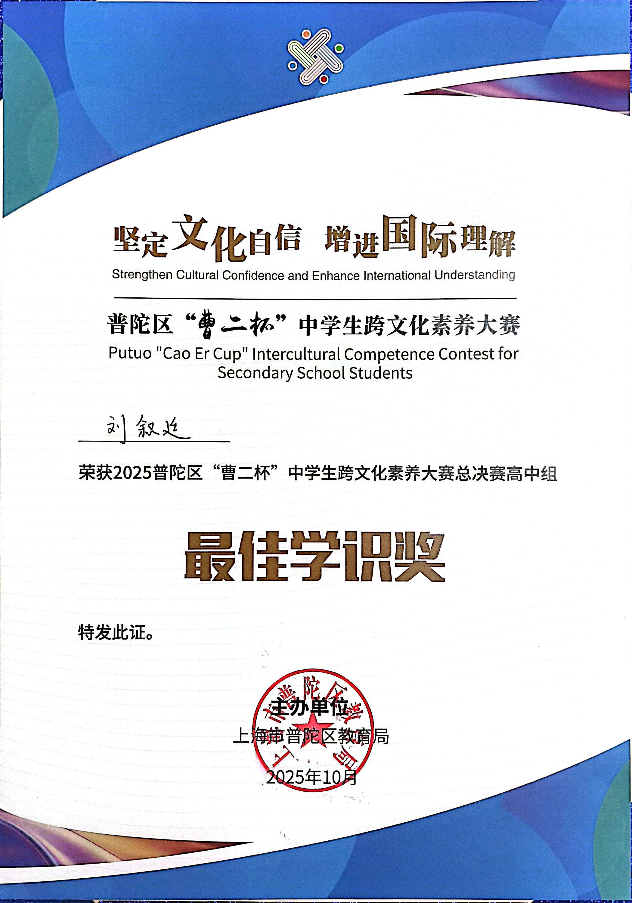 2025年10月29日,普陀区“曹二杯”中学生跨文化素养大赛在曹杨二中圆满落幕。本届大赛以“坚定文化自信,增进国际理解”为主题,吸引了全区多所中学的优秀学子组队参与。经过多轮激烈的角逐,我校代表队凭借扎实的文化素养、出色的现场发挥与默契的团队配合,荣获高中组团体一等奖,同时团队成员凭借自己的优异表现还获得了两项个人奖。这些佳绩充分体现了曹杨学子优秀的跨文化素养与综合能力。