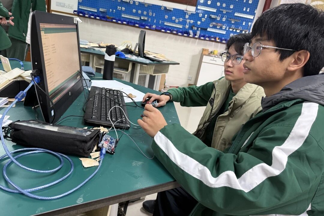 为优化小车性能,项目中融入Arduino驱动超声波测距编程实践。在指导老师带领下,同学们以Arduino Uno R3为主控板,搭配HC-SR04模块进行学习。大家先精准完成硬件接线并相互核对,再结合指导老师讲解的编程逻辑,从简单指令入手,逐步编写、完善代码,一点点探索超声波测距的工作原理——通过代码控制脉冲触发超声波发射,捕捉反射后的反馈信号,再通过编程计算转化为实时距离数据,从而实现对小车运行距离的测量。