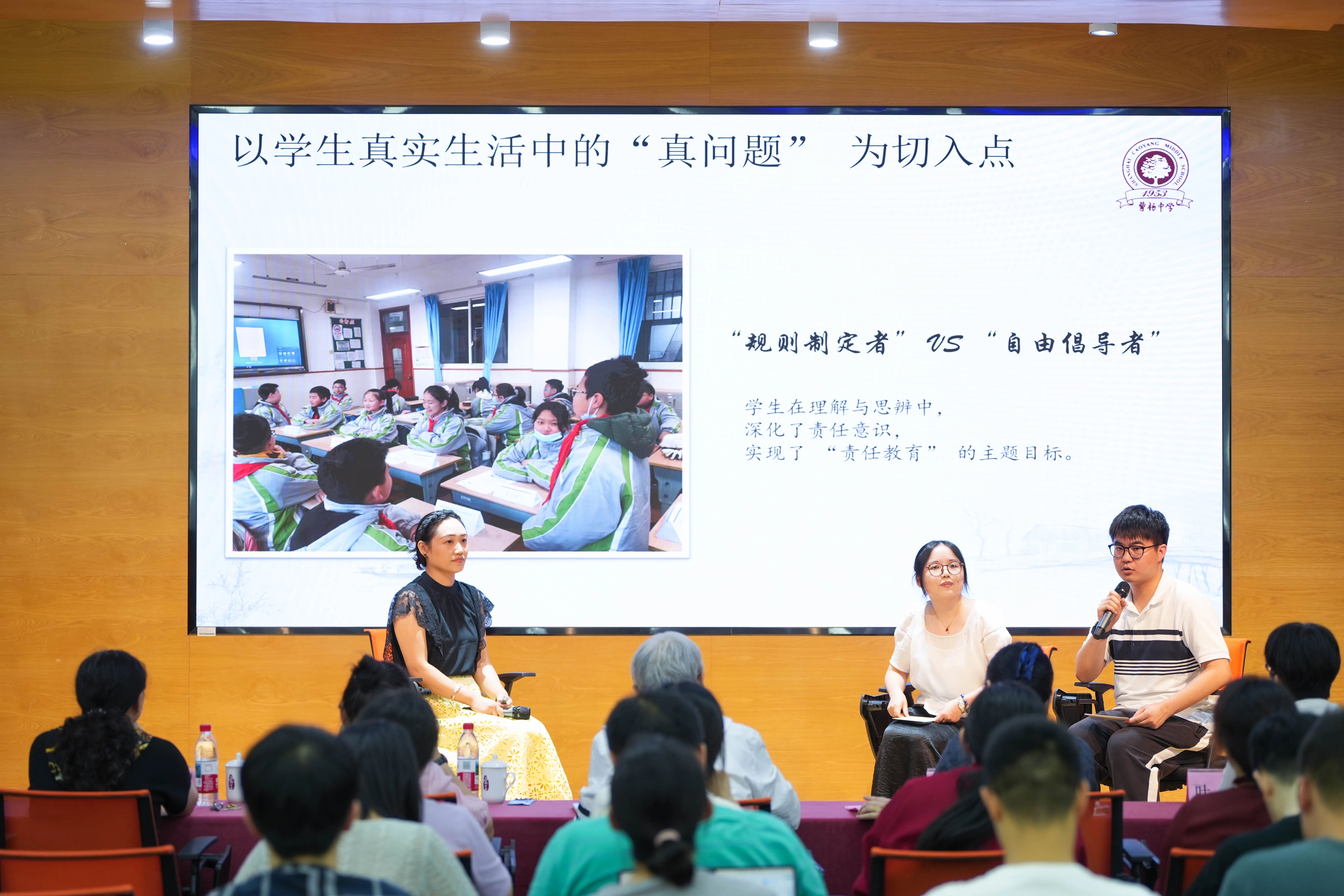 曹杨中学黄贝沁、杨雅婷、丁慧婷、曲美洁老师共同探讨了导师与班主任工作的区别和原则,强调导师要关注日常细节,抓住教育契机;保持家校沟通,提供家庭教育指导;与班主任协同互补,形成育人合力,从“经师”跨越到“人师”。生动的情景演绎展示了导师日常育人中的温情与力量。