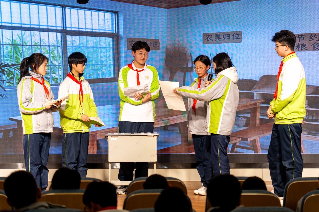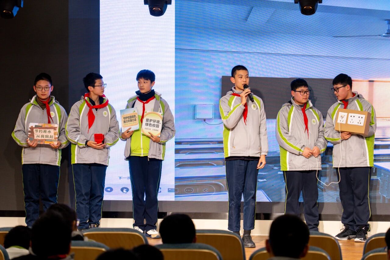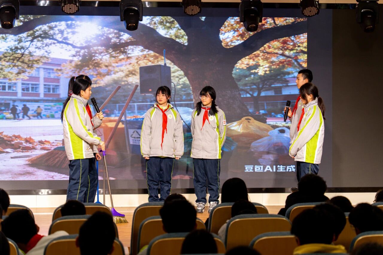 八1中队带来的《智慧农田守护者》,以紧张剧情展现了科技如何助力农业可持续发展;八2中队呈现的《AI谣言终结者》与《咖啡厅环保小管家》,分别以幽默方式破除科技谣言、彰显科技赋能环保的效能;八3中队的《绿植再生计划》,巧妙结合AI识别与废旧物改造,演绎资源循环利用;八4中队的《智能管家“翻车”记》在趣事中深刻点明“科技是工具,人才是主人”;八5中队从环保出发,通过创意研发,诠释了“知行合一”的实践理念;八6中队的情景剧生动诠释了科技赋能成长,以及学校“担当责任,自主力行”的办学理念。