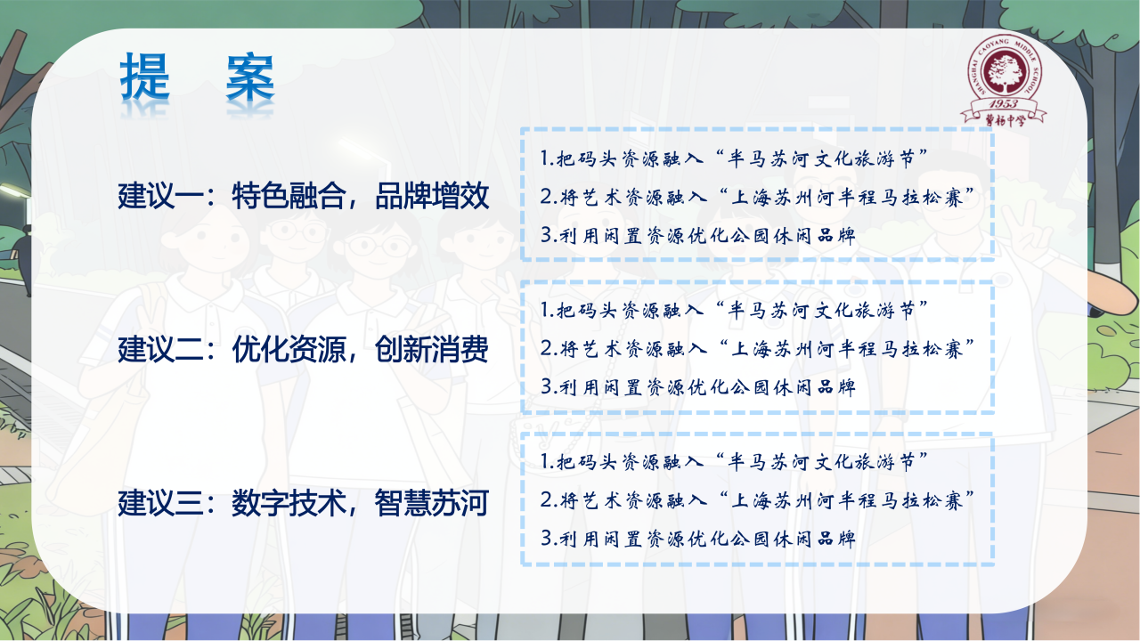 作为上海“一江一河”战略的重要组成部分,“半马苏河”发展机遇与挑战并存。同学们以“融合化”“创新化”“智慧化”破题,提出三大创新路径:一是深化资源融合,通过打造“国潮痛船”、策划“艺术半马”等项目,激发文旅品牌合力;二是创新消费体验,以主题移动街区、闲置空间盘活和“票根经济”联动机制,构建多元化、沉浸式的滨水消费场景;三是推动智慧赋能,借助数字技术构建智慧停车、宣传与导览体系,全面提升服务效能与游客体验。